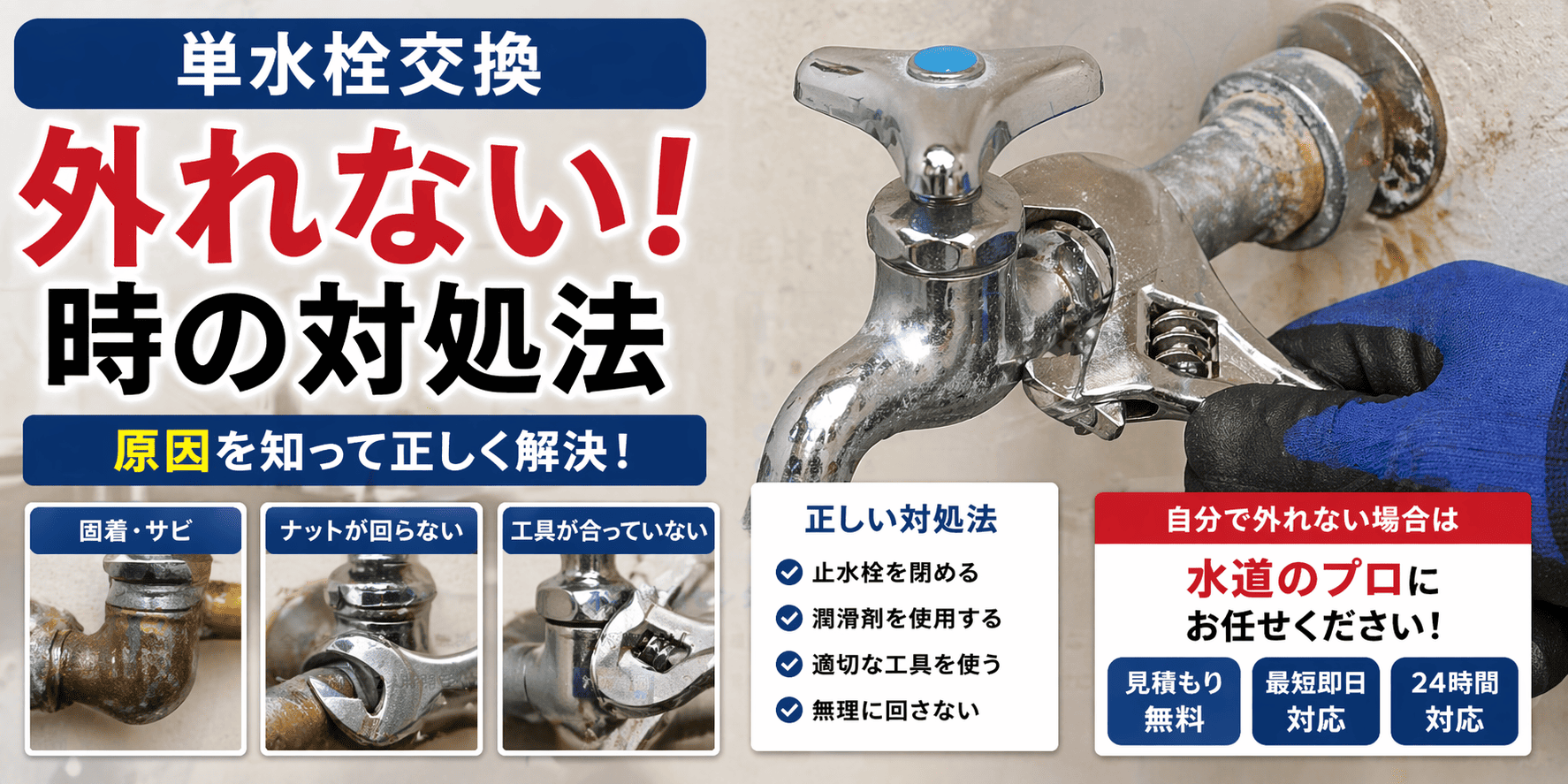 台所・洗面台・屋外蛇口などで使われている単水栓は、長年使用するとサビ・水垢・固着によって簡単に外れなくなるケースがあります。