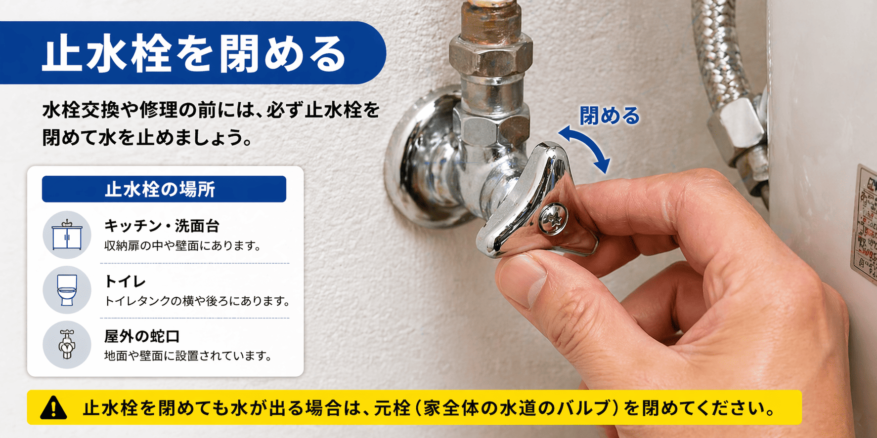 まずは必ず止水栓を閉めて水が出ないようにします。